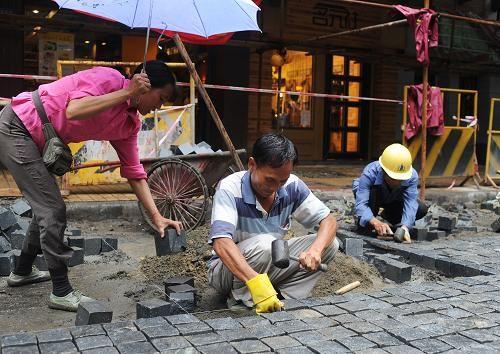 工人們?cè)跒閺V州市惠福路鋪上灰麻石