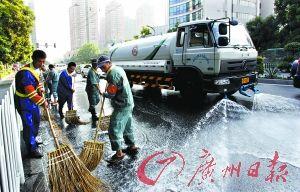 昨日早上開始,海珠區(qū)就出動8臺水車對轄內(nèi)的廣州大道、寶崗大道、新港路、新滘路、濱江路、昌崗路共計200多公里的主干道進(jìn)行全面清洗。環(huán)衛(wèi)工人主要清潔人行道、綠化花基、道路側(cè)石等地域。
