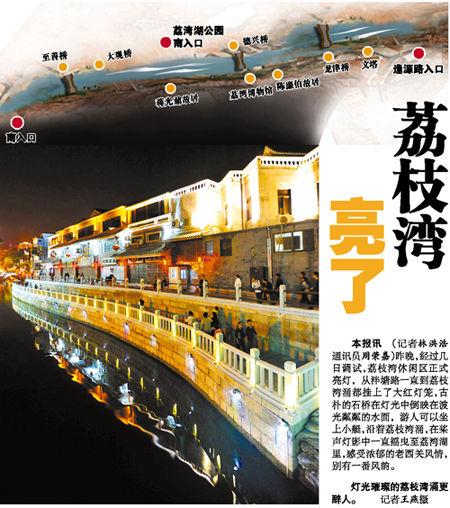 廣州日?qǐng)?bào)11月3日?qǐng)?bào)道 昨晚,經(jīng)過幾日調(diào)試,荔枝灣休閑區(qū)正式亮燈,從泮塘路一直到荔枝灣涌都掛上了大紅燈籠,古樸的石橋在燈光中倒映在波光粼粼的水面,游人可以坐上小艇,沿著荔枝灣涌,在槳聲燈影中一直搖曳至荔灣湖里,感受濃郁的老西關(guān)風(fēng)情,別有一番風(fēng)韻。
