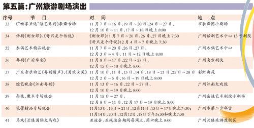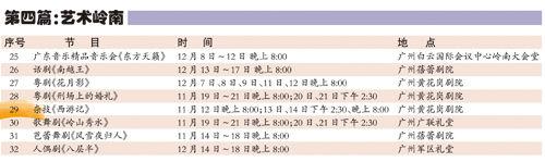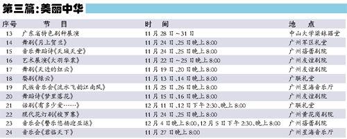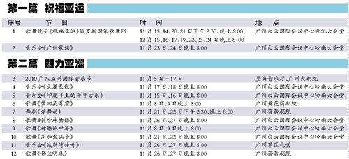 廣州日?qǐng)?bào)11月4日?qǐng)?bào)道 亞運(yùn)文藝演出時(shí)間為11月8日至12月19日,地點(diǎn)在星海音樂廳、白云國際會(huì)議中心、黃花崗劇院、友誼劇院等全市17個(gè)主要演出場館,共有來自以亞洲國家(地區(qū))為主的日本、韓國、柬埔寨、緬甸、伊朗、阿聯(lián)酋以及德國、俄羅斯等20個(gè)國家(地區(qū))的40余臺(tái)。ü(jié))目、2000多名藝術(shù)家參加演出,演出總場次為317場,預(yù)計(jì)將有超過20萬觀眾走進(jìn)劇場觀看演出。