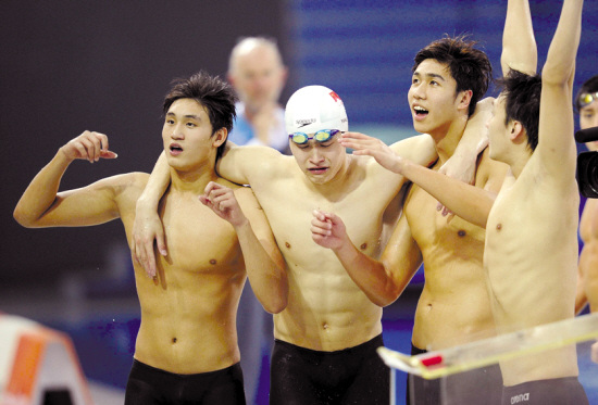 昨晚游泳比賽的最后一項是男子4×200米自由泳接力,張琳、蔣海琦、李昀琦、孫楊代表中國隊向金牌發(fā)起沖擊。4年前的多哈亞運會,他們惜敗于日本隊。廣州亞運會前,張琳和孫楊就多次表示:最希望奪得這枚團體金牌。從第一屆起,日本隊就一直是這項比賽的冠軍———14連冠,保持了56年之久的壟斷優(yōu)勢。中國隊自參加亞運會以來,只拿過7次亞軍。