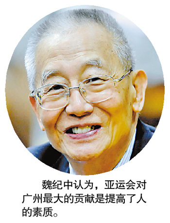 魏紀中解釋說,“軟件”是指社會服務(wù),特別是指市民素質(zhì),“在城市里,主要不是人對物而是人對人,物只是人與人之間的平臺。亞運會從長遠來說最大的貢獻是軟件——人的素質(zhì)提高了。像廣州塔,可能過20年會貶值,因為科技越來越先進,但人的素質(zhì)是升值的。所以,我們的眼睛要盯在軟件上,盯在培養(yǎng)人的素質(zhì),提高人的素質(zhì),改變?nèi)说挠^念上!