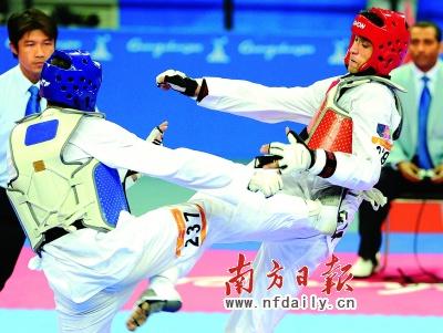 在跆拳道男子80公斤以下級決賽中,阿富汗選手內(nèi)薩爾·艾哈邁德·巴哈維(右)以3比4負于約旦選手納比勒·哈桑,獲得亞軍! ⌒氯A社發(fā)