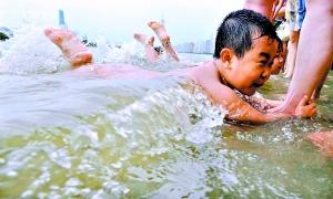 珠江邊上的親水平臺,前來洗“龍舟水”的小孩玩得特別開心。 記者邱偉榮 攝