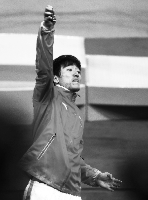 換鞋、脫衣服、換衣服———黑色T恤換成了白色T恤,上面印著劉翔的跨欄頭像。劉翔跨欄試跑后,兩手做出“六”的姿勢,感覺不錯的“飛人”喝了點礦泉水。隨后,劉翔扭扭脖子,活動活動筋骨,再脫掉訓練服,換上比賽服。