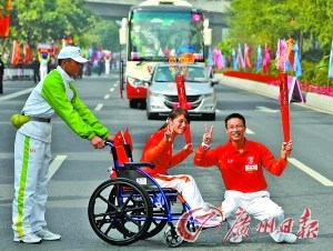 昨日上午,廣州2010年亞洲殘疾人運(yùn)動(dòng)會(huì)廣州火炬?zhèn)鬟f活動(dòng)在花城廣場(chǎng)拉開帷幕,8.8公里的路途上,共有98名火炬手參與傳遞活動(dòng),包括21名殘疾人士。他們中既有杰出的殘疾運(yùn)動(dòng)員,也有各行各業(yè)的優(yōu)秀殘疾人代表,還有默默耕耘的志愿者和廣州亞運(yùn)會(huì)中奪冠的體育健兒,做出積極貢獻(xiàn)的各方面人士。