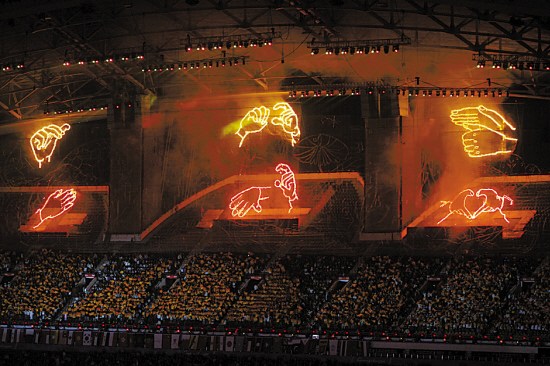 據(jù)了解,開(kāi)幕式當(dāng)晚,當(dāng)場(chǎng)內(nèi)手語(yǔ)主持人用手語(yǔ)打出“媽媽我愛(ài)你”、“朋友我愛(ài)你”、“世界我愛(ài)你”時(shí),網(wǎng)幕焰火將在夜空中打出“生命”、“陽(yáng)光”、“關(guān)愛(ài)”三組巨型手語(yǔ)圖案。作為首個(gè)手語(yǔ)煙花表演,這個(gè)獨(dú)特的創(chuàng)意來(lái)自哪里?黃剛告訴記者:“‘生命陽(yáng)光,與愛(ài)同在’的理念來(lái)自胡錦濤總書記提出的‘讓關(guān)愛(ài)的陽(yáng)光照亮每一位殘疾人的心靈’指示精神。說(shuō)起手語(yǔ),大家都會(huì)想起殘疾人,但是一般人對(duì)手語(yǔ)并不太了解,我希望這個(gè)煙花能夠激發(fā)人們對(duì)手語(yǔ)的好奇心,去了解手語(yǔ),并關(guān)注殘疾人,進(jìn)而學(xué)會(huì)關(guān)愛(ài)殘疾人!