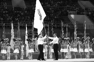 下一站,天津 閉幕式上,國家體育總局局長劉鵬(右)將中華人民共和國運動會會旗交給天津市市長黃興國。第十三屆全運會將于2017年在天津舉行。新華社發(fā)