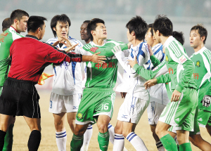 在補(bǔ)時(shí)了長(zhǎng)達(dá)7分鐘后,主裁判阿卜杜拉終于吹響了終場(chǎng)結(jié)束的哨音,但裁判的3聲長(zhǎng)哨卻變?yōu)椤皼_鋒號(hào)”,兩隊(duì)隊(duì)員再次糾纏到一起,最后北京警方不得不進(jìn)入場(chǎng)內(nèi)控制局面,才讓怒火中燒的兩隊(duì)球員返回各自休息室。