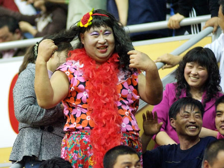 “如花”顯然是有備而來,他戴著花圍巾、穿著花衣裳,賽前先是戴著一個黑色的發(fā)套現(xiàn)身。比賽中他還到洗手間重新打扮,換上紅藍相間的發(fā)套再回到賽場。據(jù)當?shù)孛襟w記者介紹,這個球迷是江蘇舜天隊的鐵桿球迷,大家都稱他“胖哥”。在足球場上,這個球迷也是如此打扮為江蘇舜天隊加油,看到舜天本周沒有比賽,他就到籃球賽場上來“湊熱鬧”了。(記者潘天舒)