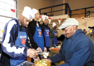 昨天,易建聯(lián)(左圖左一)和卡特、哈里斯等籃網(wǎng)隊員一起來到新澤西的一家教堂,在感恩節(jié)到來之際,向當?shù)厣鐓^(qū)貧困居民分發(fā)食品。在活動現(xiàn)場,易建聯(lián)身著便裝頭戴一頂繡有籃網(wǎng)標志的廚師帽發(fā)放食物,整個活動過程中易建聯(lián)始終面帶微笑,并和獲贈食物的居民親切交談。