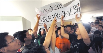 昨天上午11點(diǎn),300余名國(guó)安球迷涌入國(guó)安足球俱樂(lè)部?jī)?nèi)短短二三十米長(zhǎng)的通道,他們高舉著“黃牛大哥,給我們留條活路”的標(biāo)語(yǔ),情緒十分激動(dòng),抗議“黃牛”壟斷門票,要求俱樂(lè)部保障球迷的利益。由于人數(shù)眾多,現(xiàn)場(chǎng)的暖氣片也被球迷擠壞,暖氣管道里的水灑了一地,廢棄的飲料瓶等雜物也隨處可見(jiàn)。陸續(xù)有數(shù)名民警趕到現(xiàn)場(chǎng)維持秩序,防止球迷出現(xiàn)過(guò)激行為。