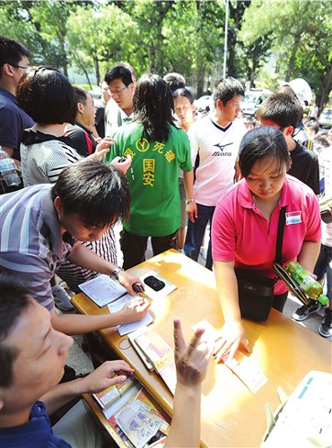 據(jù)球迷王先生介紹,他想要購(gòu)買的是本月30日國(guó)安對(duì)陣魯能的比賽門票!瓣P(guān)系到國(guó)安今年能否在中超奪冠,作為十幾年的國(guó)安球迷,這場(chǎng)比賽我們必須去見(jiàn)證!睘橘I到門票,王先生昨天早上5點(diǎn)就到工體北門守候。當(dāng)時(shí)排在他前面的人只有5個(gè),按照當(dāng)天該售票點(diǎn)發(fā)售500張票、每位球迷限買兩張票的情況,他覺(jué)得無(wú)論如何都能買上票。
