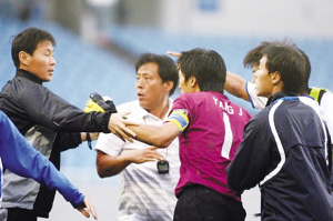 然而與舜天輸球相比,昨天比賽最大的看點(diǎn)就是被稱為“桑拿裁判”的陶然成在比賽中遭到天津隊(duì)圍攻的事情,由于對點(diǎn)球判罰的不滿,天津隊(duì)群情憤怒,如果不是南京公安的阻攔,差點(diǎn)就重演了天津全運(yùn)隊(duì)爆追何志彪并一腳將其推倒的好戲。