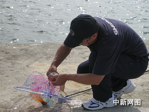 有一名來自安徽的選手顯然是這路“武功”里的豪放派。當(dāng)魚急著四處游走想擺脫魚鉤的束縛時,這位“大俠”卻好整以暇地以單手控竿,巧妙地跟著魚的力量調(diào)整好釣線的角度,最后猛地使出一個“拔蔥式”——一條大魚頓時從水里“一飛沖天”,頗為委屈地重重拍在了地上。