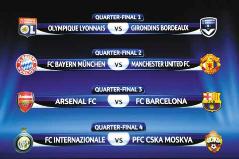 歐冠1/4決賽和半決賽對陣形勢昨晚在瑞士尼翁揭曉,上半?yún)^(qū)是拜仁慕尼黑對曼聯(lián)、里昂對波爾多,下半?yún)^(qū)是阿森納對巴塞羅那、國際米蘭對莫斯科中央陸軍,“重逢”成為本次抽簽的主題。由英超球隊(duì)包辦半決賽3個席位的乏味場面本賽季絕不會出現(xiàn)了,本賽季8強(qiáng)來自6個國家的聯(lián)賽。