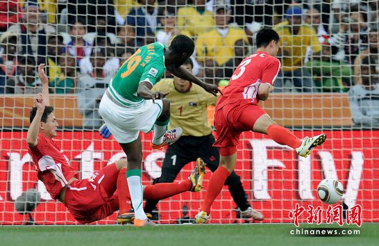 第11分鐘,科特迪瓦隊邊路策動進攻,埃布將球傳中,德羅巴接到頭球攻門將球打入,不過他和另外一名隊友都處于越位位置,進球無效。1分鐘后,科特迪瓦隊再次發(fā)動猛攻,熱爾維尼奧禁區(qū)內打門,球被朝鮮隊門將李明國撲住。