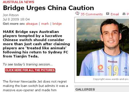 中新網(wǎng)7月9日電 布里奇,一個天津泰達隊球迷都不會陌生的名字。這位澳大利亞外援曾在本賽季初效力于天津泰達隊,現(xiàn)在已經(jīng)離開中超加盟悉尼FC隊。日前他在接受澳大利亞《442》雜志采訪時憤怒的回憶了在中超的悲慘生活。他表示,中超的球員就像畜生一樣被對待。
