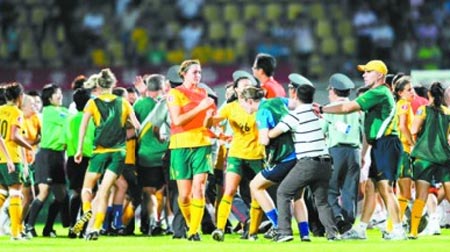 8月3日晚,中國青年女足在武漢2∶1險勝澳大利亞隊,亞青賽兩連勝提前小組出線,但在比賽結(jié)束后,雙方發(fā)生沖突,一名澳大利亞球員將中國球員張越打倒,雙方替補(bǔ)球員和教練見狀全部沖到場內(nèi),一片混亂之后,經(jīng)過亞足聯(lián)官員的親自協(xié)調(diào),事件才平息。據(jù)了解,澳球員之所以“發(fā)飆”,是覺得輸?shù)煤堋案C囊”,覺得“中國隊做了裁判工作”。路透社的報道說“這起事件無疑對中國足球的聲譽又是一次打擊。 ”但事實上,算上上周日中超聯(lián)賽重慶隊主教練阿里·哈恩的“瘋狂咆哮”,連續(xù)兩次都是外國教練和外國球員在中國綠茵撒野,這里必須要問一句:憑什么?