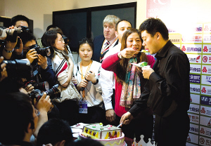 贏得了比賽,走進新聞中心的丁俊暉非常開心,“今天比賽很精彩,打得還可以,上來就比較集中精力,今天比較動腦子,一個機會得分,還能贏下比賽!边@時的丁俊暉完全不知道還有一個意外的驚喜在等著他。在簡單回答了記者的幾個問題之后,賽事組委會的工作人員推上了一個臺球桌形狀的生日蛋糕。現(xiàn)場所有的記者和工作人員共同為丁俊暉唱響了生日歌,整個新聞中心變成了一個生日party!在所有人的祝福聲中,丁俊暉吹滅了生日蠟燭、切了蛋糕。