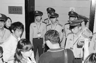 郭晶晶是否真的去找吳敏霞了?這個(gè)記者并不清楚,不過(guò)據(jù)記者了解吳敏霞不出席新聞發(fā)布會(huì)是因?yàn)楹ε卤弧罢`傷”。在郭晶晶第一次離開(kāi)新聞發(fā)布會(huì)現(xiàn)場(chǎng)時(shí),記者也跟了出去。吳敏霞當(dāng)時(shí)剛剛接受完央視的采訪正準(zhǔn)備走進(jìn)更衣室,但此時(shí)竟然有一位簽名的男FANS跟著吳敏霞走進(jìn)了更衣室,不過(guò)好在現(xiàn)場(chǎng)武警反應(yīng)迅速,將他“揪了”出來(lái)。見(jiàn)現(xiàn)場(chǎng)形勢(shì)已經(jīng)非常混亂,武警索性集體站在了女更衣室的門(mén)口,一位現(xiàn)場(chǎng)工作人員邊打著電話,邊嚷著“守好,誰(shuí)都不讓進(jìn)去”。
