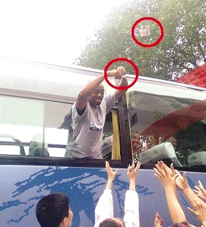 5月23日晚上,湖南湘西某地有關(guān)方面邀請(qǐng)美國(guó)體育使者男子明星籃球隊(duì)與立陶宛蘇托瓦職業(yè)男子籃球隊(duì)在該地體育館舉行對(duì)抗賽。賽前,兩支球隊(duì)分別到當(dāng)?shù)氐囊恍┲袑W(xué)進(jìn)行訪問,然而,在5月22日美國(guó)體育使者男子明星籃球隊(duì)到市第一中學(xué)訪問時(shí)出現(xiàn)讓人憤怒的一幕,一美國(guó)球員在車輛離開校園時(shí)打開窗戶,向圍觀的中學(xué)生撒人民幣,造成現(xiàn)場(chǎng)一度失控。