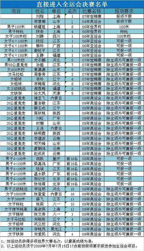 7月10日,中國田徑協(xié)會(huì)公布了直接進(jìn)入全運(yùn)會(huì)決賽的田徑運(yùn)動(dòng)員名單。劉翔、邢慧娜、黃瀟瀟、周春秀等45名選手列入名單。入選名單的運(yùn)動(dòng)員還必須在2009年7月15日17時(shí)前,按報(bào)名項(xiàng)目要求報(bào)送參加全運(yùn)會(huì)比賽的報(bào)名申請。