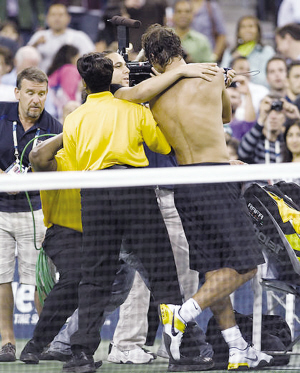 在9月8日納達(dá)爾戰(zhàn)勝法國(guó)選手蒙菲斯的比賽后,一名男子沖入場(chǎng)地并親吻了納達(dá)爾,他也因此遭到逮捕。