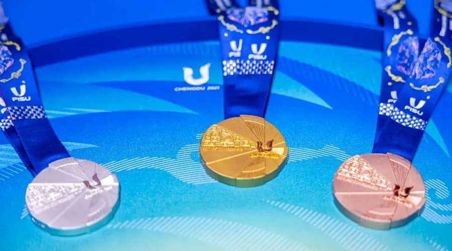 獎(jiǎng)牌形態(tài)呈現(xiàn)出不規(guī)則的圓形,以致敬太陽與青春;獎(jiǎng)牌會(huì)徽面特設(shè)“文明時(shí)光墻”,刻畫了從象形文字“蜀”到現(xiàn)代漢字“雄起”等不同時(shí)期的中國(guó)文字