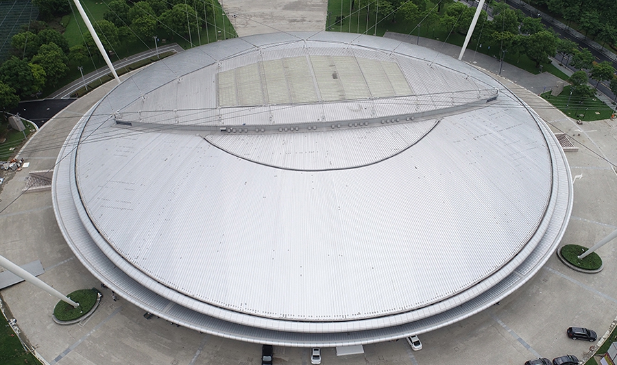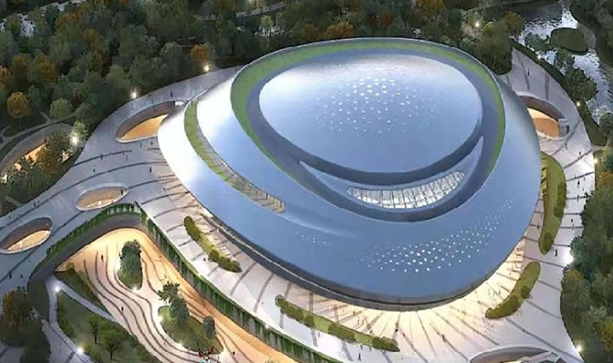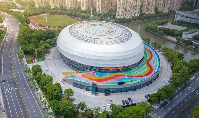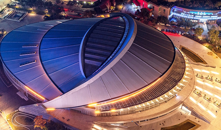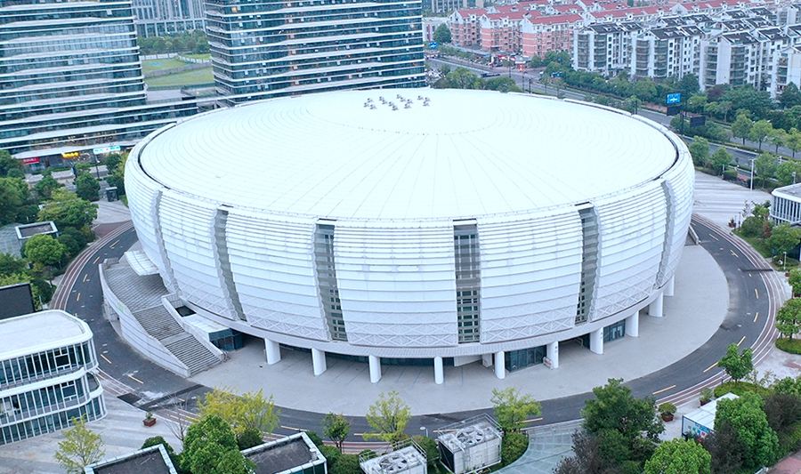 紹興奧體中心體育館為亞運會籃球項目比賽場館,位于紹興市越城區(qū),在亞運村東南方向且相距約38.8公里??偨ㄖ娣e72010平方米,觀眾席位數(shù)9552座。場館圓形的外殼,規(guī)則的銀灰色流線型線條,像是江南水鄉(xiāng)常見的河蚌。
