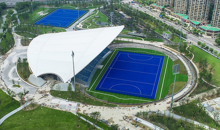 拱墅運河體育公園體育場為亞運會曲棍球項目比賽場地,位于杭州市拱墅區(qū),在亞運村西北方向且相距約14.5公里,含主比賽場和熱身場、兩層賽時配套用房,賽后將作為游客接待中心使用。總建筑面積27121平方米,觀眾席位數(shù)4870座。