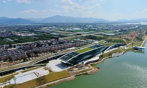 溫州龍舟運動中心為亞運會龍舟項目比賽場地及訓(xùn)練場館,位于溫州市甌海區(qū),含綜合館、終點塔及觀龍臺。龍舟競渡在溫州已有二千年歷史,溫州市被稱為“中國龍舟名城”,該基地賽后將永久性保留,作為全國最專業(yè)的龍舟競賽基地??偨ㄖ娣e23713平方米,觀眾席位數(shù)344座,沿河兩岸約有20000個站席。