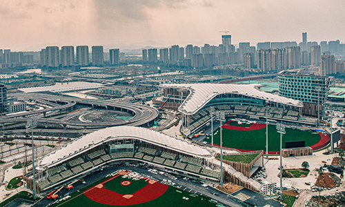 紹興棒(壘)球體育文化中心為亞運會棒壘球項目比賽場地,位于紹興柯橋區(qū)和鏡湖新區(qū)交界處、杭紹臺高速公路鏡湖互通附近。其中,棒球項目用地面積 120666平方米,總建筑面積 145000 平方米,其中地上建筑面積89200平方米,地下建筑面積55800平方米。功能區(qū)包括一個棒球主場(座位數(shù)5000個),一個棒球副場(座位數(shù)2500個),一個集訓(xùn)中心和一個體能訓(xùn)練館。壘球項目用地面積 42666平方米,建筑面積8000平方米,含一個壘球主場(座位數(shù)2000個),一個壘球副場(座位數(shù)500個)。