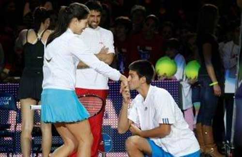 5歲的時候就認(rèn)識,并且開始一起學(xué)習(xí)網(wǎng)球,德約科維奇和伊萬諾維奇可謂是青梅竹馬、兩小無猜,感情自然不是一般的深厚。眼見著如今20歲的小伊日漸出落成了一個大美女,小德也頗有些耐不住寂寞,就在澳網(wǎng)前夕,在家鄉(xiāng)貝爾格萊德的一場表演賽上,德約科維奇還當(dāng)眾上演了“求婚秀”——在伊萬諾維奇面前單膝跪地,并且用哀求的眼光看著對方,最后還深情地吻了阿娜的手背,讓小美女“嚇”得不輕。