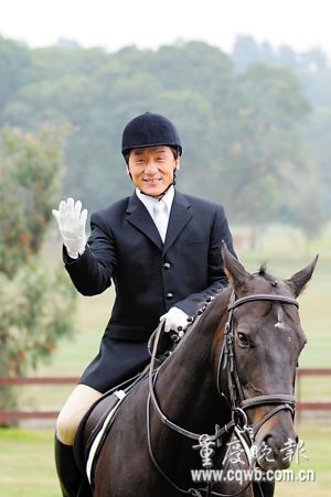 盡管成龍?jiān)诒娙诵哪恐械男蜗蟾嗍且晃还Ψ蛎餍,不過追星族近期看到他穿起馬靴、戴起馬帽化身馬術(shù)騎士,代言今年夏天在中國香港舉行的奧運(yùn)馬術(shù)賽!2008年在奧運(yùn)馬術(shù)賽城市——香港見,”身著一身騎師裝束的成龍說,他同時在鏡頭前抓著一匹漂亮黑馬的韁繩。