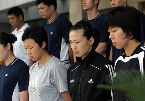 下午14時(shí)許,全隊(duì)一反平日午休的習(xí)慣,匯集在基地體育賓館大堂,姑娘們都刻意回避穿著那套紅色的運(yùn)動(dòng)服。14時(shí)25分,全體教練員、運(yùn)動(dòng)員在國(guó)家排球運(yùn)動(dòng)管理中心徐利主任的帶領(lǐng)下,在賓館外整齊列隊(duì),徐利主任說(shuō):“根據(jù)國(guó)務(wù)院公告,為表達(dá)全國(guó)各族人民對(duì)四川汶川大地震遇難同胞的深切哀悼,中國(guó)女排隊(duì)為遇難者默哀!14時(shí)28分寧波北侖空襲警報(bào)聲劃破長(zhǎng)空,體育賓館外的馬路上,汽車笛聲四起,女排姑娘們神色凝重,低頭為7天前的這個(gè)時(shí)刻遭受地震劫難的人們默哀。