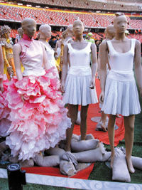 “不行、不行,這太不行了。”昨天,一名購票參觀鳥巢的游客,看到場地中心的“2008奧運(yùn)會、殘奧會開閉幕式服裝道具展”后,連連搖頭嘆息。他面前,是身著開閉幕式各色服裝卻清一色肉色絲襪蒙面的模特,顯得很“寒磣”。大多數(shù)游客認(rèn)為該展覽“慘不忍睹”、“與鳥巢不相符合”以及“不夠尊重奧運(yùn)工作者和游客”。