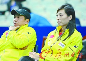 今天下午的女單首輪角逐,嚴厲的“張指導”正式登場。鮮黃色的運動外套加上黑色的運動長褲,張寧的形象依然十分運動,與運動員時期所不同的僅有兩點,首先是她可以任意展示一頭披肩秀發(fā),不需要用橡皮筋和發(fā)卡把它們扎得嚴嚴實實,其次是她背著一個黑色的單肩包,那是中國隊教練員的標志。目前中國女隊的主教練仍然是老帥唐學華,跟在主教練身后,張寧步入賽場并正襟危坐場外指導教練席。