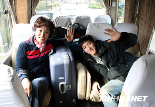 12月3日,劉翔(右)與母親向記者揮手致意。