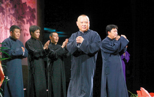 郭德綱、于謙合作10周年專場演出14日如約開場,現(xiàn)場座無虛席。此番亮相的郭德綱顯得頗為低調(diào),他在對話中表示,自己只是一個說相聲的,“能力有限,水平一般”。此次演出郭德綱個人為舟曲災(zāi)區(qū)捐出了10萬元,德云社和演出承辦方也各捐出5萬元,對于因為哀悼日而暫停的15日的演出,郭德綱表示:所有15日票的觀眾都可以去退票,也可以留著,等我們開演的時候繼續(xù)使用,F(xiàn)在不是我們不訂演出時間,實在是北展后面的演出太多了,一切需要重新協(xié)調(diào)!