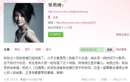 張雨綺在微博中表示:“我和汪小菲的感情已經(jīng)結(jié)束了。分開主要是兩人性格不太合適,彼此有一段時(shí)間不大聯(lián)系,也不知對方狀況,我也是和大家一起知道了這個(gè)消息。我相信這是好事兒。他很出色,我由衷祝他幸福!我投入《白鹿原》的緊張準(zhǔn)備和拍攝已有半年時(shí)間,這是一部需要也值得全身心投入的電影,正是我最喜愛的事情。謝謝!”
