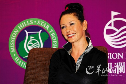 在昨日出席比賽的眾多明星中,好萊塢女星凱瑟琳·澤塔·瓊斯無疑是最受媒體關注的一個。瓊斯與丈夫邁克·道格拉斯都是高爾夫球達人,對于兩人的球技較量,凱瑟琳謙虛地說:“丈夫比我打得好多了,不過我打球的姿勢比他好看!”