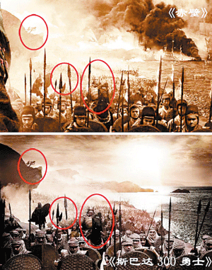 一張《赤壁》和《300勇士》的對(duì)比照昨日成為網(wǎng)友熱議的焦點(diǎn)。照片發(fā)布者圈出吳宇森新片《赤壁》官方海報(bào)中和《斯巴達(dá)300勇士》劇照的相似之處,并直指《赤壁》抄襲。對(duì)此中影營(yíng)銷(xiāo)分公司負(fù)責(zé)人直斥“無(wú)聊炒作”,并稱(chēng)“每款海報(bào)都有不同的風(fēng)格!