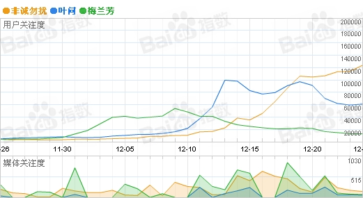 而對(duì)于其他幾部影片,“葉問(wèn)”的搜索量排在第二,最高的時(shí)候逼近10萬(wàn),但已經(jīng)呈現(xiàn)下滑趨勢(shì),好在網(wǎng)友對(duì)它的評(píng)價(jià)極好,幾乎一致的贊不絕口,這將幫助拉動(dòng)其后期票房;“赤壁”將于1月8日上映,目前其搜索次數(shù)還很少,大致在1萬(wàn)多徘徊,百度的數(shù)據(jù)預(yù)測(cè)它可能達(dá)不到《赤壁上》3億多的票房記錄;“梅蘭芳”上映時(shí)間最早,網(wǎng)民的搜索次數(shù)已經(jīng)持續(xù)走低,預(yù)計(jì)其票房將排名第四;至于“女人不壞”,目前網(wǎng)民的日搜索量?jī)H1萬(wàn)多,盡管網(wǎng)友的口碑極好,但預(yù)期也較低。