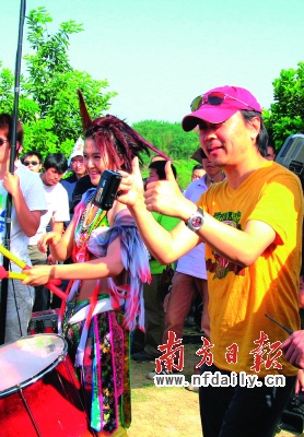 據(jù)悉,“五一”期間在成都舉辦的熱波音樂節(jié)是片中一個(gè)拍攝場景。從記者獲得的劇照來看,譚維維正率領(lǐng)一群裝扮火辣的鼓手,一邊打鼓一邊起舞,場面動(dòng)感。而譚維維的造型也是首度曝光,她以一身清涼露臍裝亮相,加上具有民族元素的鮮艷裝飾和文身點(diǎn)綴,更顯火辣。尤其是她的發(fā)型卡通味道濃郁,一縷縷火箭般的沖天直發(fā),十分夸張。
