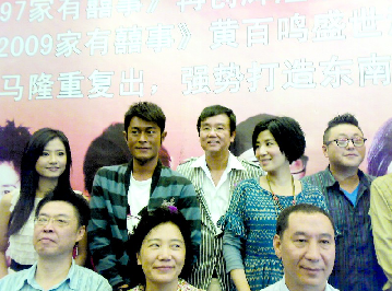 昨日下午杭州雨后天晴,如香港東方電影公司老總黃百鳴的心情,因?yàn)椤都矣邢彩隆废盗须娪霸陂焺e銀幕11年之后,終于有機(jī)會(huì)制造《家有喜事2009》。昨天該片在杭州舉行了開機(jī)新聞發(fā)布會(huì),主演吳君如、古天樂(lè)、黃百鳴、鄭中基、姚晨、郭濤等等一干明星全體出席。