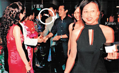 對于Karen早前指T富商與她相好時一直隱瞞有家室,T富商前日展示了兩張02年其正室次子結(jié)婚時的照片,原來當時Karen也出席了這個婚宴,而且還與T富商的正室握手。T富商說:“02年我兩個做保險的女性朋友介紹下認識Karen,后來我兒子結(jié)婚,我就請她來。所以她怎么會不知我有家室呀?”