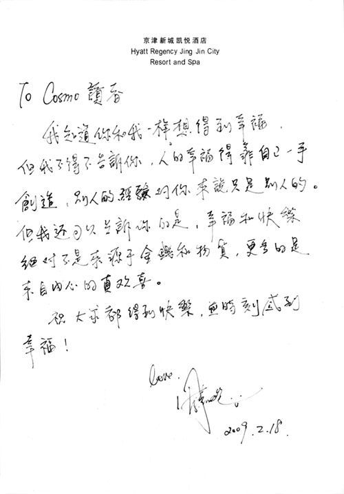 有做筆跡分析的朋友見過周慧敏的字。她寫道,她的字,是淑女之筆,品相和筆畫運(yùn)勢上,都均勻而美觀,控制不夸張,足以見得周慧敏內(nèi)心的穩(wěn)定與成熟,懷抱著對一切美好的期許,或者遇到很多不如意,也還是堅(jiān)持硬撐。