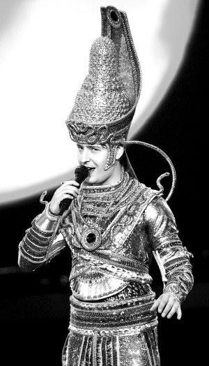 維塔斯火起來是在2000年,克里姆林宮一曲《歌劇2》,真是驚為天人。那時(shí)的他愛穿標(biāo)志性的窄身黑西裝,戴著一條紅圍巾,跨越5個(gè)八度的不可思議的海豚音,給人的感覺神秘而空靈。昨天的維塔斯卻以一身紅色的機(jī)器人服飾出場(chǎng),剛開始的幾個(gè)高音完全聽不出原有的清亮,眉眼也因?yàn)榘l(fā)胖而顯得模糊,依稀能看見個(gè)熟悉的輪廓,但魅惑的精魄已經(jīng)散去。從無字《詠嘆調(diào)》到《我的太陽(yáng)》再到《今夜無人入眠》,一首首經(jīng)典曲目在他口中變得千篇一律,而中文曲目《大海啊大!贰肚嗖馗咴方o人刻意討好的感覺。每次唱到高潮部分,維塔斯總會(huì)因?yàn)槭治枳愕付^演唱,一段段熟悉的旋律就此在他游離的眼神間劃過,好像磁帶突然跳帶,讓人很不過癮。