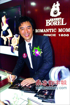 上周五鐘鎮(zhèn)濤到廣州為某手表品牌在正佳廣場開業(yè)做宣傳。雖然已出道三十多年,但穿上筆挺的黑色西裝,鐘鎮(zhèn)濤依然帥氣十足。他透露最近準(zhǔn)備親自動筆寫自傳,書名暫定“阿B正傳”,因?yàn)槠胀ㄔ捖犉饋砭拖瘛鞍正賺”,是“好意頭”。